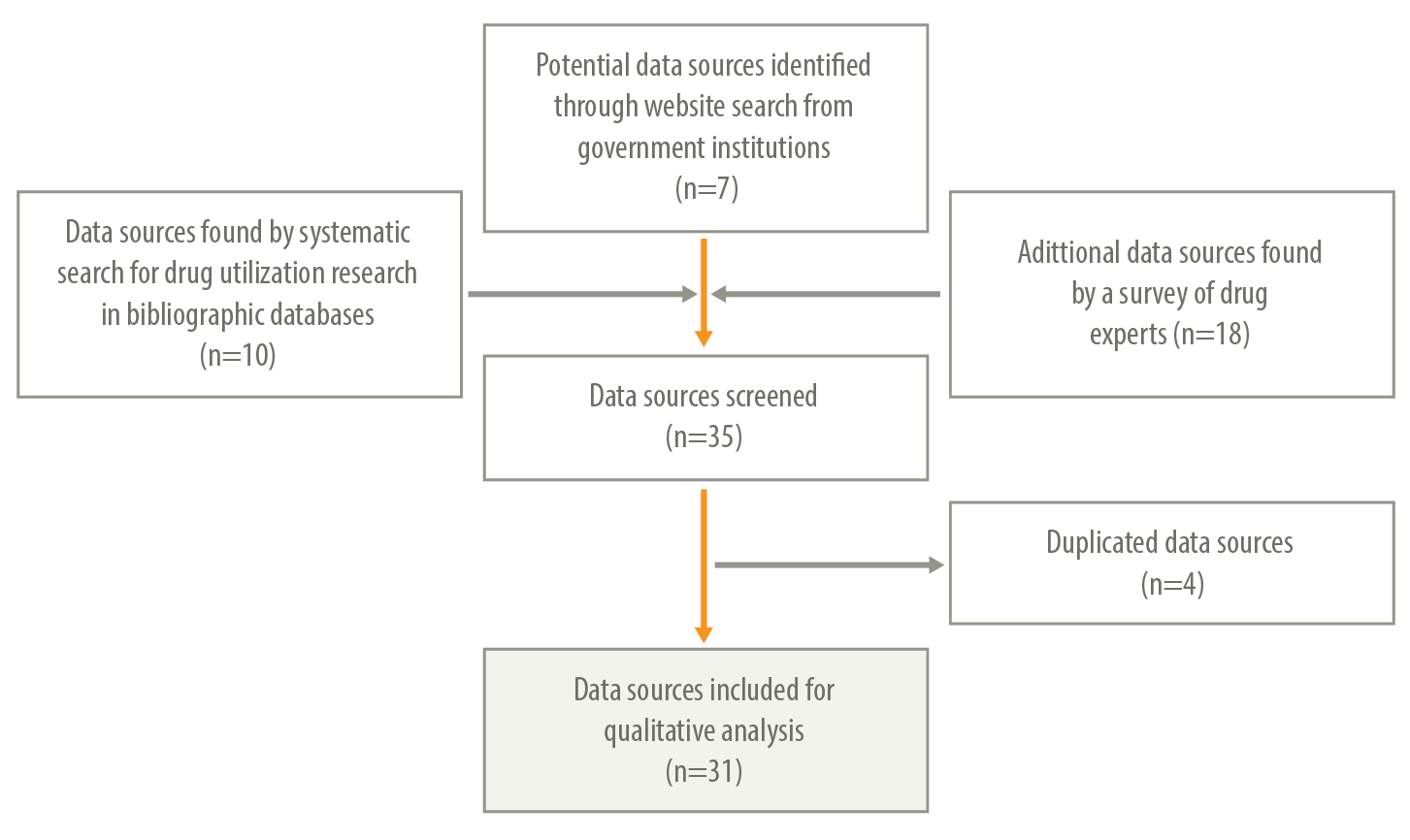 Se identificaron un total de 35 fuentes de datos públicamente disponibles. Siete bases de datos se obtuvieron de los sitios web oficiales sobre utilización de medicamentos, 10 fuentes de datos a partir de las búsquedas bibliográficas y 18 fuentes de datos adicionales de nivel provincial se identificaron a través de la encuesta en línea que incluyó respuestas de 30 expertos en medicamentos.