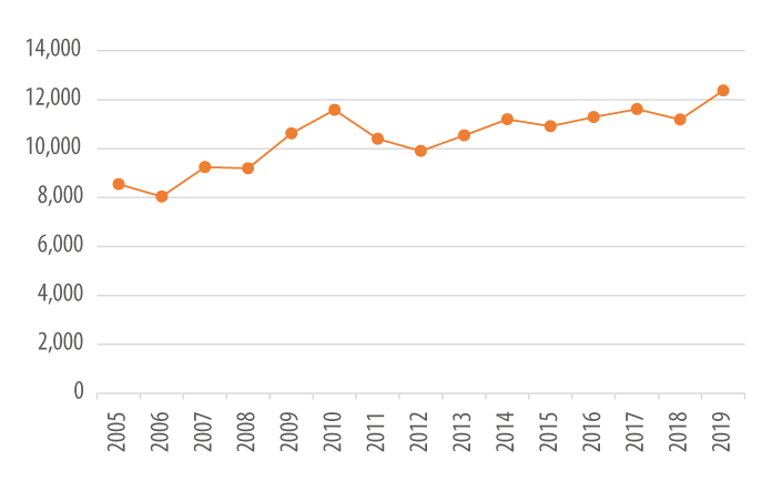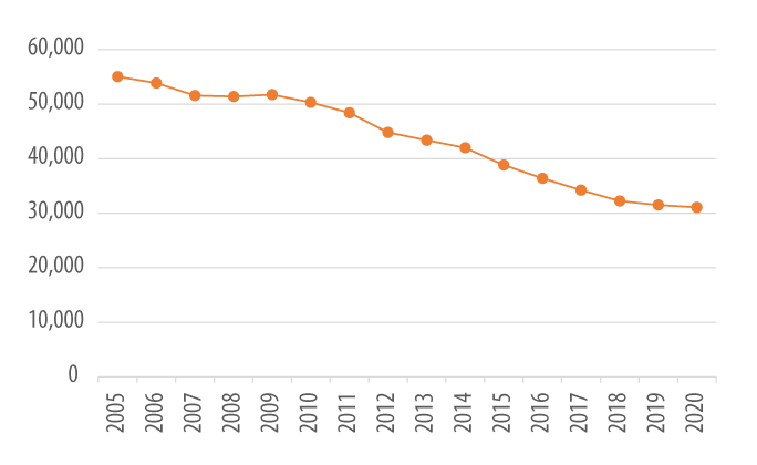 Figura 2. Número de camas psiquiátricas en hospitales públicos. Brasil, 2005-2020.