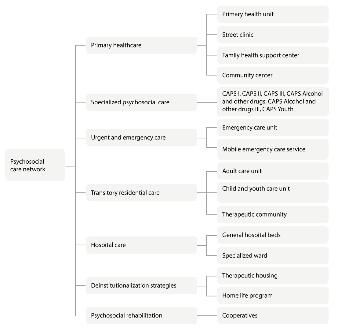 Se implementaron camas hospitalarias en hospitales generales, limitadas a un máximo de 10 camas, Centro de Atención Psicosocial (CAPS III) con un promedio de 10 camas, urgencias generales y servicios de derivación hospitalaria por alcohol y otras drogas. La red de camas asistenciales debe integrarse y, por tanto, sustituir los hospitales psiquiátricos y las hospitalizaciones de larga duración.