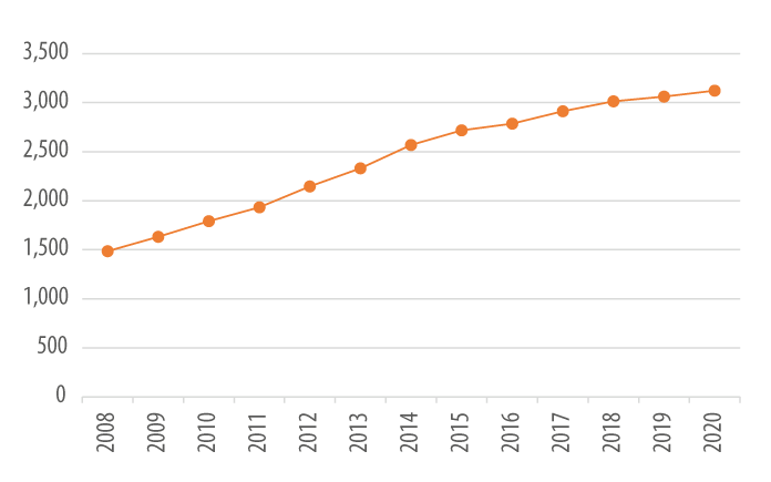 De 2006 a 2020, el Ministerio de Salud20 incrementó su apoyo a los estados y municipios para agilizar sus esfuerzos hacia la desinstitucionalización. Algunas de sus acciones fueron: aumento del número de CAPS; acceso a la atención de urgencia y emergencia (SAMU y UPA) con un equipo especializado en atención en salud mental; disponibilidad de camas de crisis en los hospitales generales articulados con la red; y regulación de acceso a la Red de Atención Psicosocial que garantiza la primacía de los servicios territoriales. Pero en los últimos tres años ha habido una fuerte desaceleración en la apertura de nuevos CAPS, como se ilustra en la (Figura 5).