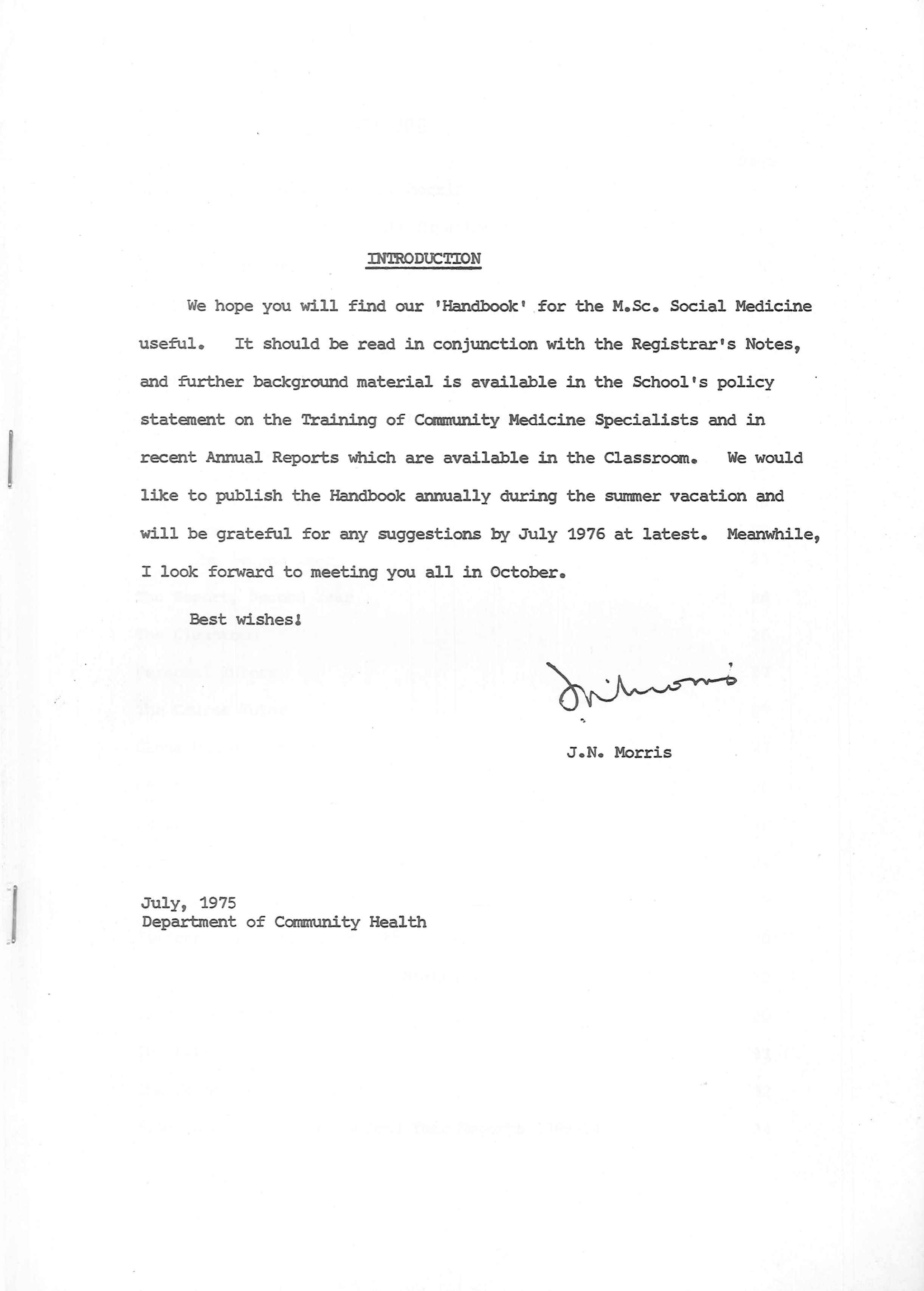 Fuente: Documento donado en 2013 por Mario Testa al Centro de Documentación Pensar en Salud, que puede consultarse en el Fondo Mario Testa. Nota: En la portada mecanografiada se lee “Introducción: Esperamos que encuentren útil nuestro ‘Manual’ para la Maestría en Medicina Social. Debe leerse en conjunto con las Notas del Secretario Académico, y se dispone de material adicional en la declaración de políticas de la Escuela sobre la Formación de Especialistas en Medicina Comunitaria, así como en los Informes Anuales recientes que están disponibles en el Aula. Nos gustaría publicar el Manual anualmente durante las vacaciones de verano y agradeceremos cualquier sugerencia a más tardar en julio de 1976. Mientras tanto, espero encontrarme con todos ustedes en octubre. Saludos cordiales, J.N. Morris, Julio de 1975, Departamento de Salud Comunitaria.