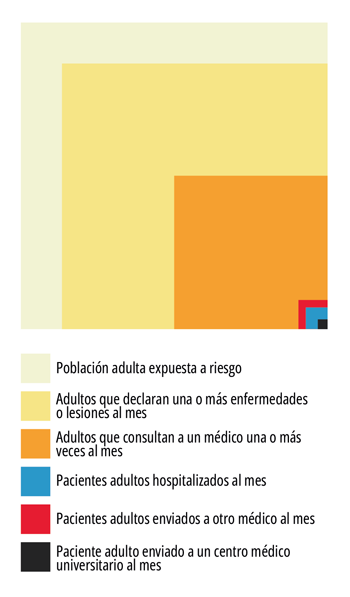 El modelo socioepidemiológico de atención en salud digital constituye un contrapunto a la lógica individualizante de la clínica tradicional, al proponer enfoques centrados en poblaciones, territorios, trayectorias de cuidado y determinantes sociales. Su principal característica es el uso de indicadores sociodemográficos y epidemiológicos para analizar patrones de salud, enfermedad y acceso a los servicios, articulando ciencia, políticas públicas y participación social. Su principal referencia lógica es el esquema de Kerr White, un marco conceptual relevante que muestra que la mayor parte de los problemas de salud no son tratados en servicios especializados (Figura 1).